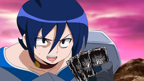 デスマッチ団から村を護ったダンたちは、ソフィアに案内されXレアの神殿へ向かった。森を抜けると、扉をこじ開けようとしている硯が居た。硯に反応するようにマギサの杖が青く光りだす。どうやら青の戦士らしい。そんな一同に、ソフィアは月が出た夜に姿を現すというカードを護って欲しいという。ダンが硯に同意を求めるべく振り返るとその姿はなく、神殿に向かっているのが見えた。
