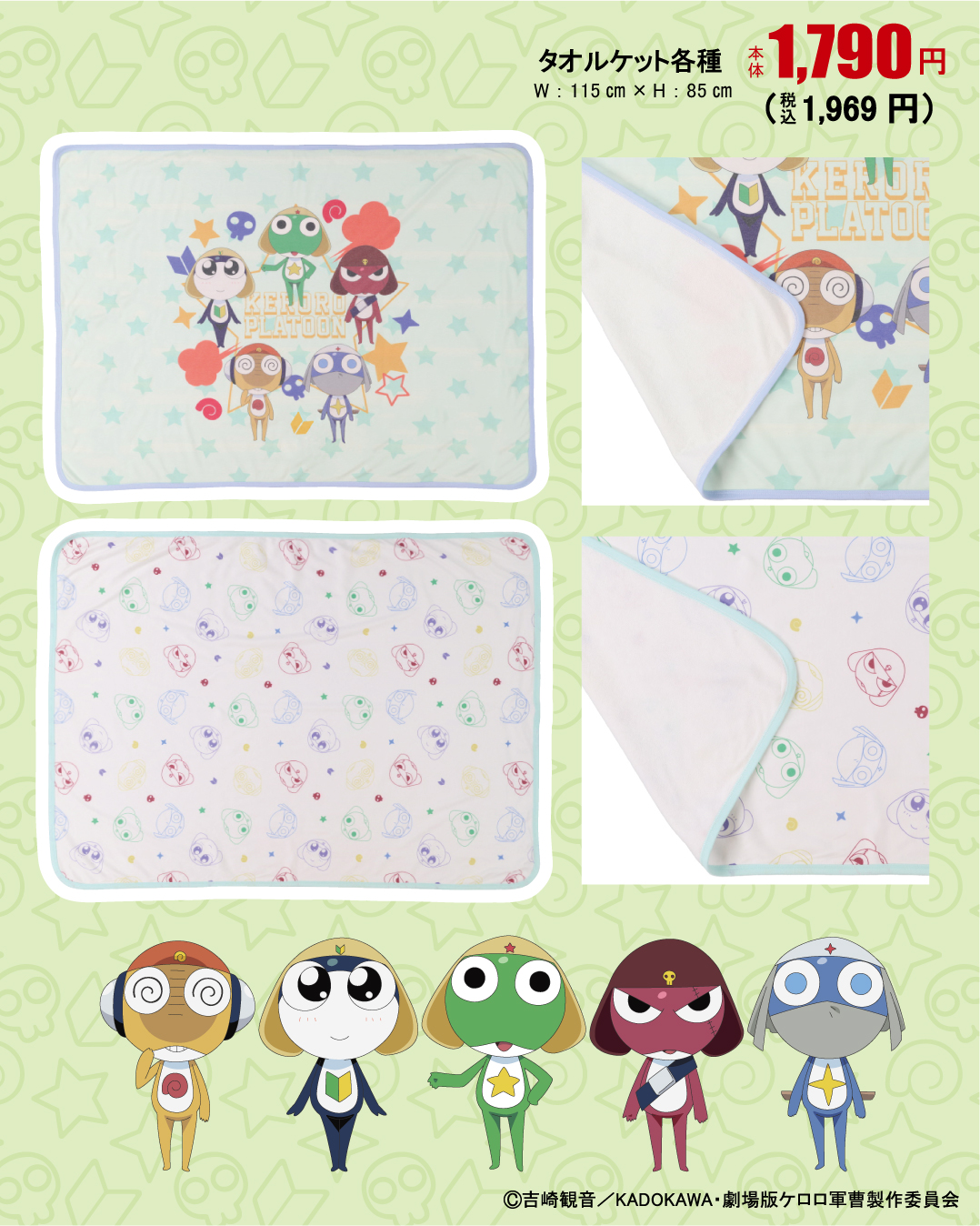ケロロ軍曹のタオルケットが登場! ケロロ軍曹のキャラクターをプリントし、季節を問わず快適に使える商品となっています。 室内でも室外でも活躍する1枚です。